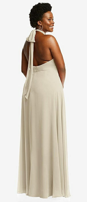 Plunge Halter Open-Back Maxi Bias Dress with Low Tie Back in champagne
