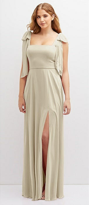 Bow Shoulder Square Neck Chiffon Maxi Dress in champagne