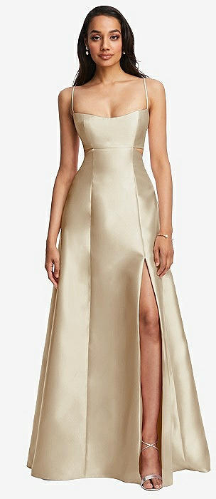 Spaghetti Strap Draped Skirt Gown with Front Slit in champagne