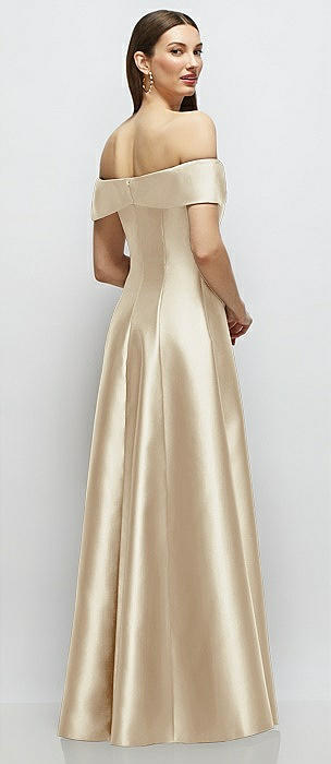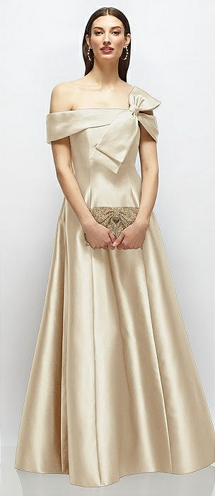 Asymmetrical Bow Off-Shoulder Satin Gown with Ballroom Skirt in champagne