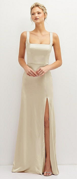 Square-Neck Satin A-line Maxi Dress with Front Slit in champagne