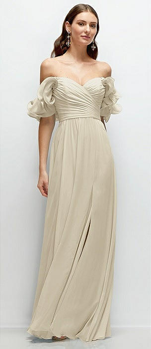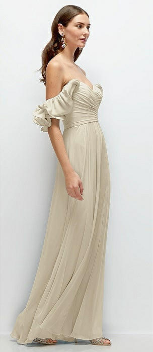 Off-the-Shoulder Draped Chiffon Maxi Dress in champagne