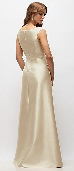 Basque-Neck Satin Column Maxi Dress with Off-the-Shoulder Bows in champagne