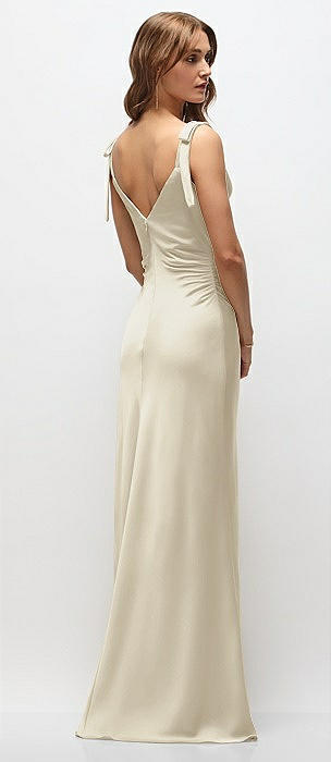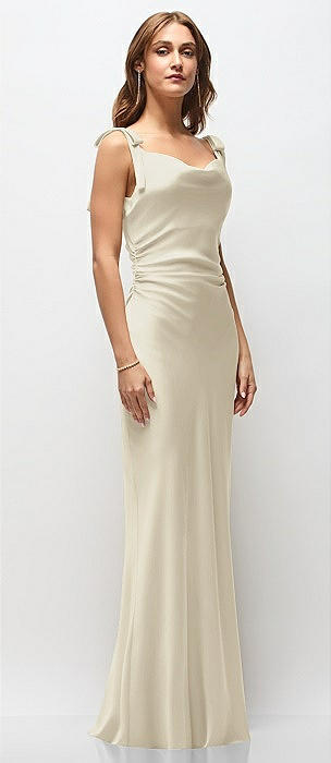 Soft Cowl Neck Ruched Side Satin Bias Maxi Dress with Shoulder Bows in champagne