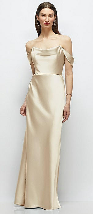 Basque-Neck A-Line Stretch Satin Maxi Dress with Off-the-Shoulder Drape in champagne