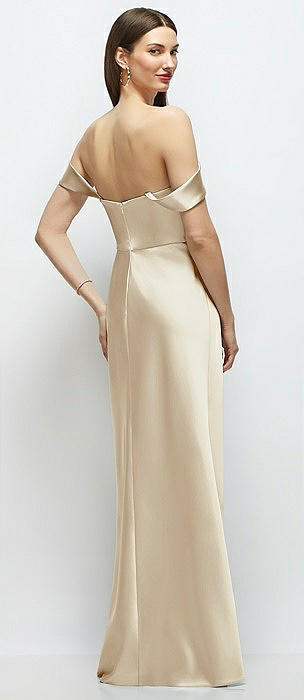 Off-the-Shoulder Bow-Back Satin Trumpet Gown in champagne