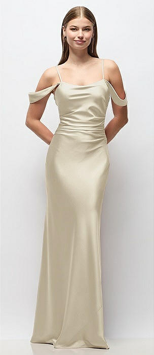 Off-the-Shoulder Swag Ruched Side Satin Bias Maxi Dress with Adjustable Spaghetti Straps in champagne