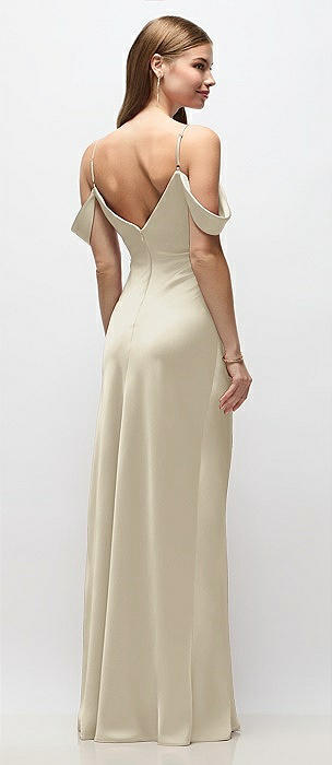 Basque-Neck Satin Column Maxi Dress with Off-the-Shoulder Bows in champagne