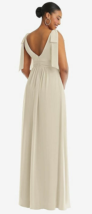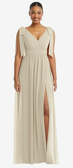 Plunge Neckline Bow Shoulder Empire Waist Chiffon Maxi Dress in champagne