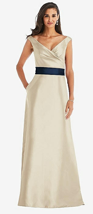 Off-the-Shoulder Draped Wrap Satin Maxi Dress in champagne