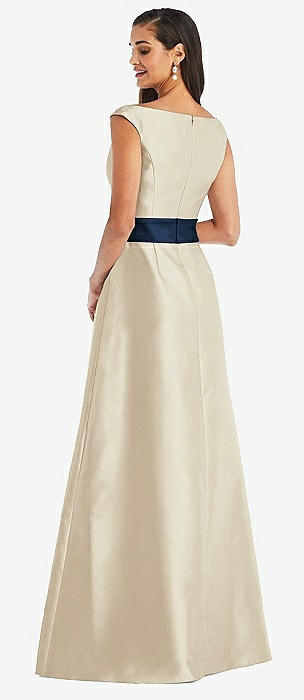 Basque-Neck Strapless Satin Gown with Mini Sash in champagne