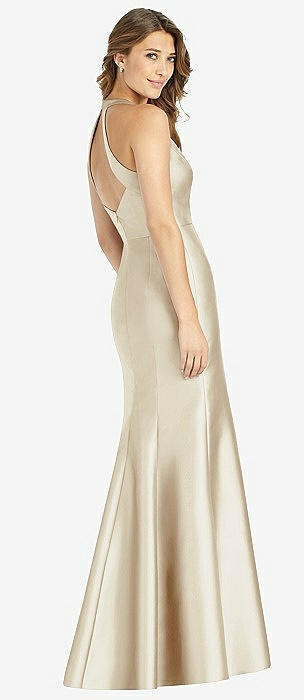 Deep V-back Satin Trumpet Dress with Cascading Bow at One Shoulder in champagne