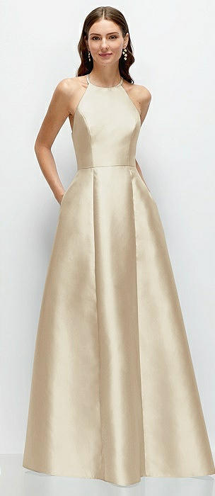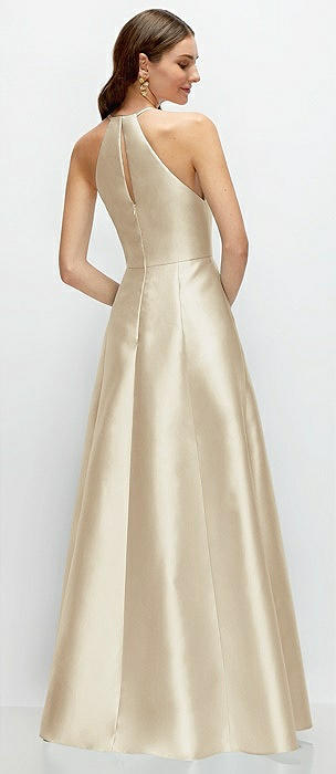 Jewel Neck Halter Full A-Line Satin Maxi Dress in champagne