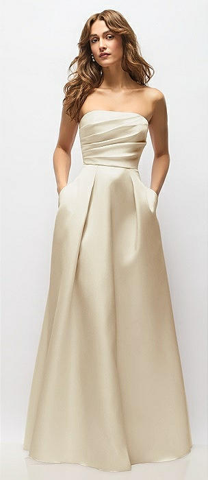Strapless Bias Cuff Bodice Satin Gown with Pockets in champagne