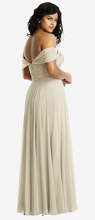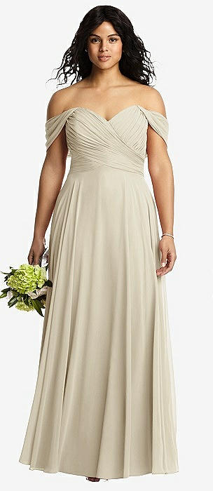Dessy Champagne Off-The-Shoulder Bridesmaid Dresses