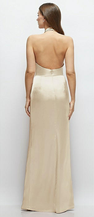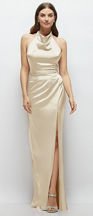 Cowl Halter Open-Back Satin Maxi Dress in champagne