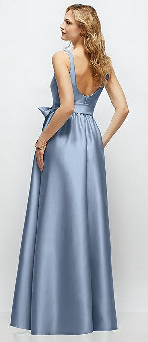 Square Neck Satin Midi Dress with Full Skirt & Flower Sash in cloudy
