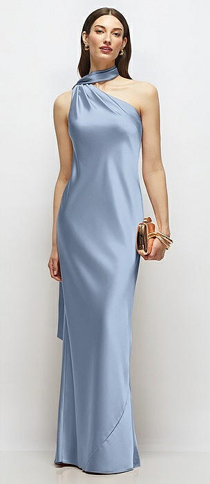 Draped Scarf One-Shoulder Bias Stretch Satin Maxi Dress in cloudy