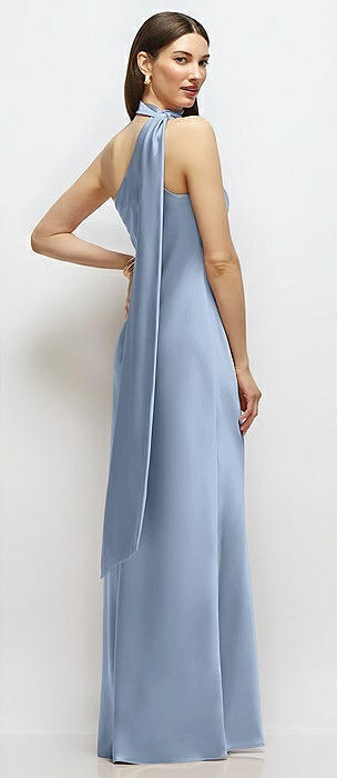 Draped Scarf Halter Open-Back Stretch Satin Bias Maxi Dress with Adjustable Straps in cloudy