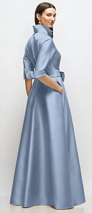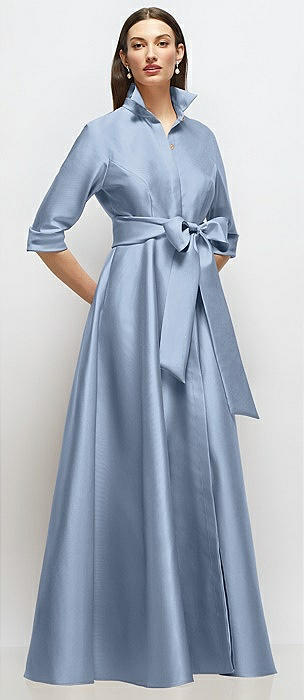3/4 Sleeve Satin Shirt Dress Gown with Sash and Jeweled Buttons in cloudy