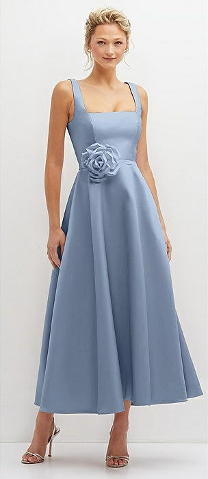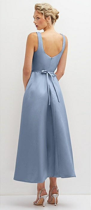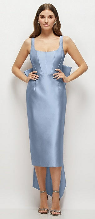 Scoop Neck Corset Satin Midi Dress with Floor-Length Bow Tails in cloudy