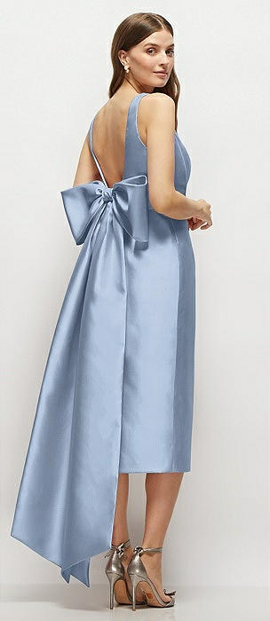 Scoop Neck Satin Column Midi Dress with Bow at Empire Waist in cloudy