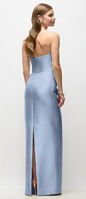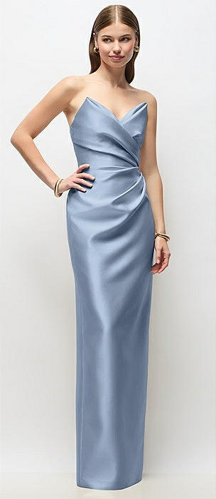 Strapless Asymmetrical Draped Satin Column Maxi Dress in cloudy