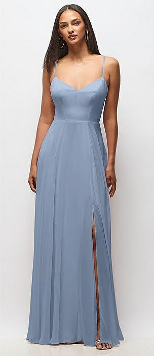 Bow-Shoulder V-Back Chiffon Gown with Front Slit in cloudy