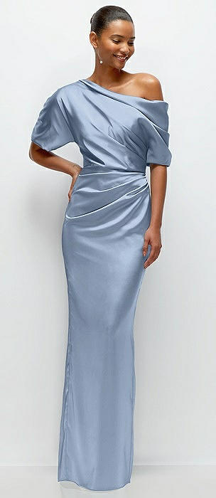 Asymmetrical Off-the-Shoulder Pleated Satin Maxi Dress in cloudy