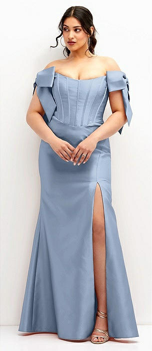 Off-the-Shoulder Bow Satin Corset Dress with Fit and Flare Skirt in cloudy