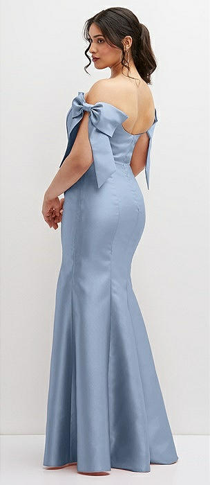 Deep V-back Satin Trumpet Dress with Cascading Bow at One Shoulder in cloudy