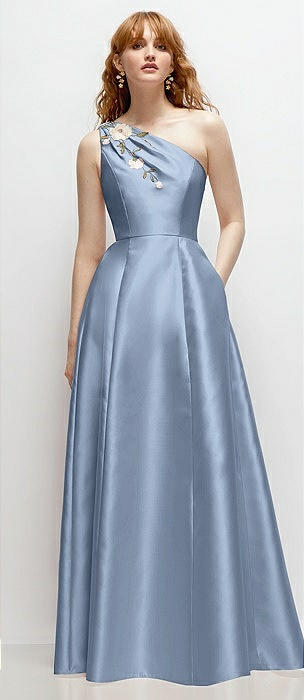 One-Shoulder Full A-Line Satin Gown with Handworked Floral Appliqué in cloudy