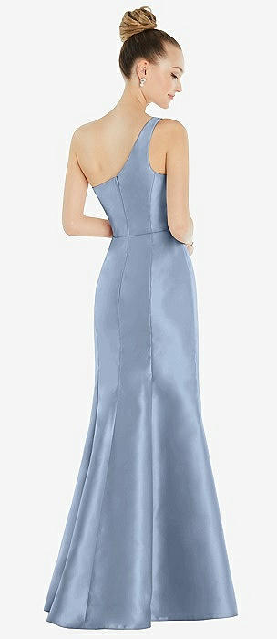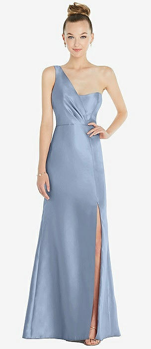 Draped One-Shoulder Satin Trumpet Gown with Front Slit in cloudy