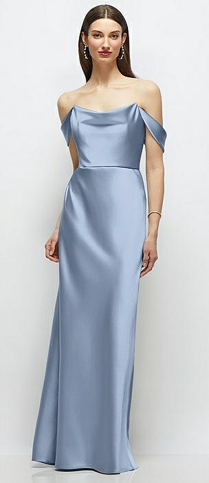 Basque-Neck A-Line Stretch Satin Maxi Dress with Off-the-Shoulder Drape in cloudy