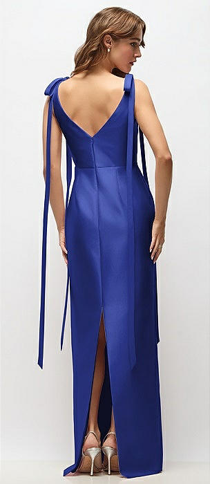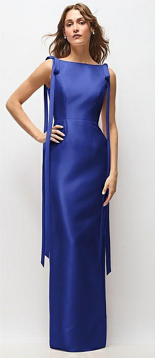 Bateau Neck Satin Column Maxi Dress with Exaggerated Tail Bow Straps in cobalt blue