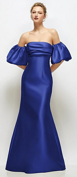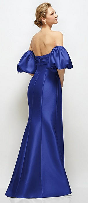 Off-the-Shoulder Puff Sleeve Satin Maxi Dress with Flared Skirt in cobalt blue