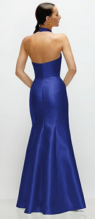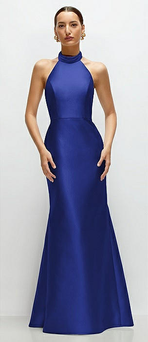 High-Neck Halter Open-Back Satin Trumpet Dress in cobalt blue