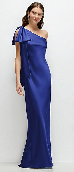 One-Shoulder Bias-Cut Satin Maxi Dress with Cascading Shoulder Bow in cobalt blue