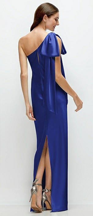 Oversized Bow One-Shoulder Satin Column Maxi Dress in cobalt blue