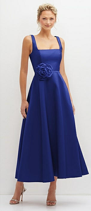 Square Neck Satin Midi Dress with Full Skirt & Flower Sash in cobalt blue