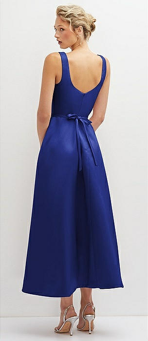 Square Neck Satin Midi Dress with Full Skirt & Pockets in cobalt blue