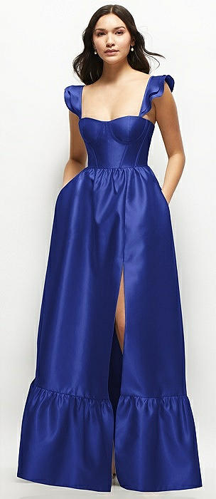 Satin Corset Maxi Dress with Ruffle Straps & Skirt in cobalt blue