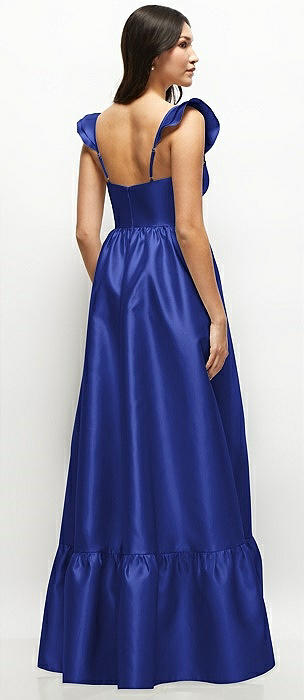Bow-Shoulder Satin Maxi Dress with Asymmetrical Tiered Skirt in cobalt blue