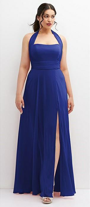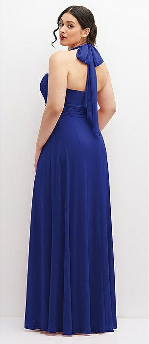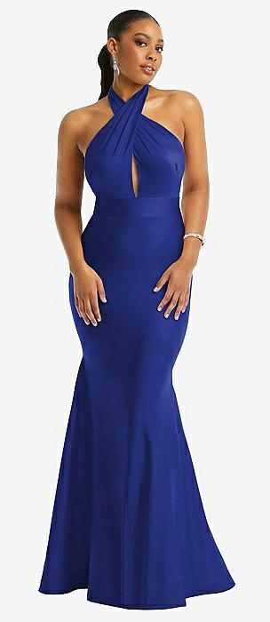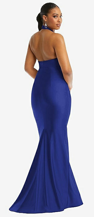 Tie Halter Open Back Trumpet Gown in cobalt blue