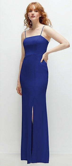Cowl-Neck Wide Strap Crepe Trumpet Gown with Front Slit in cobalt blue