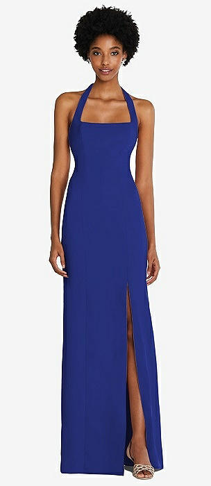 Shirred Skirt Jewel Neck Halter Dress with Front Slit in cobalt blue