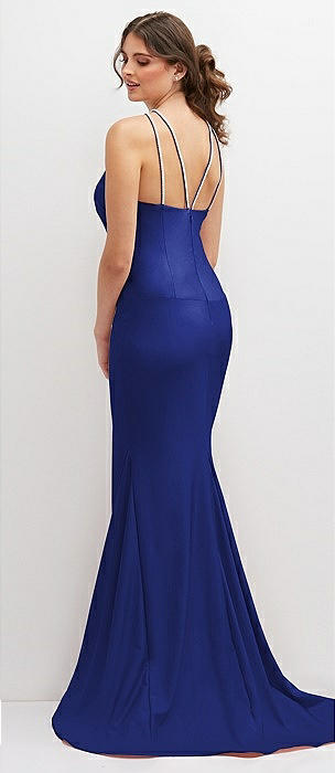 Halter Asymmetrical Draped Stretch Satin Mermaid Dress with Rhinestone Straps in cobalt blue