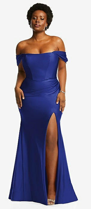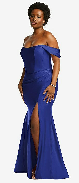 Off-the-Shoulder Corset Stretch Satin Mermaid Dress with Slight Train in cobalt blue