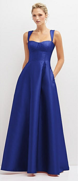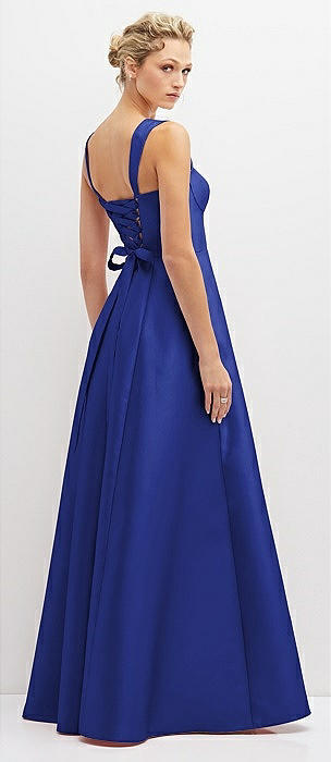 Lace-Up Back Bustier Satin Dress with Full Skirt and Pockets in cobalt blue