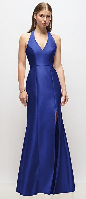 V-Neck Halter Satin Trumpet Gown in cobalt blue
